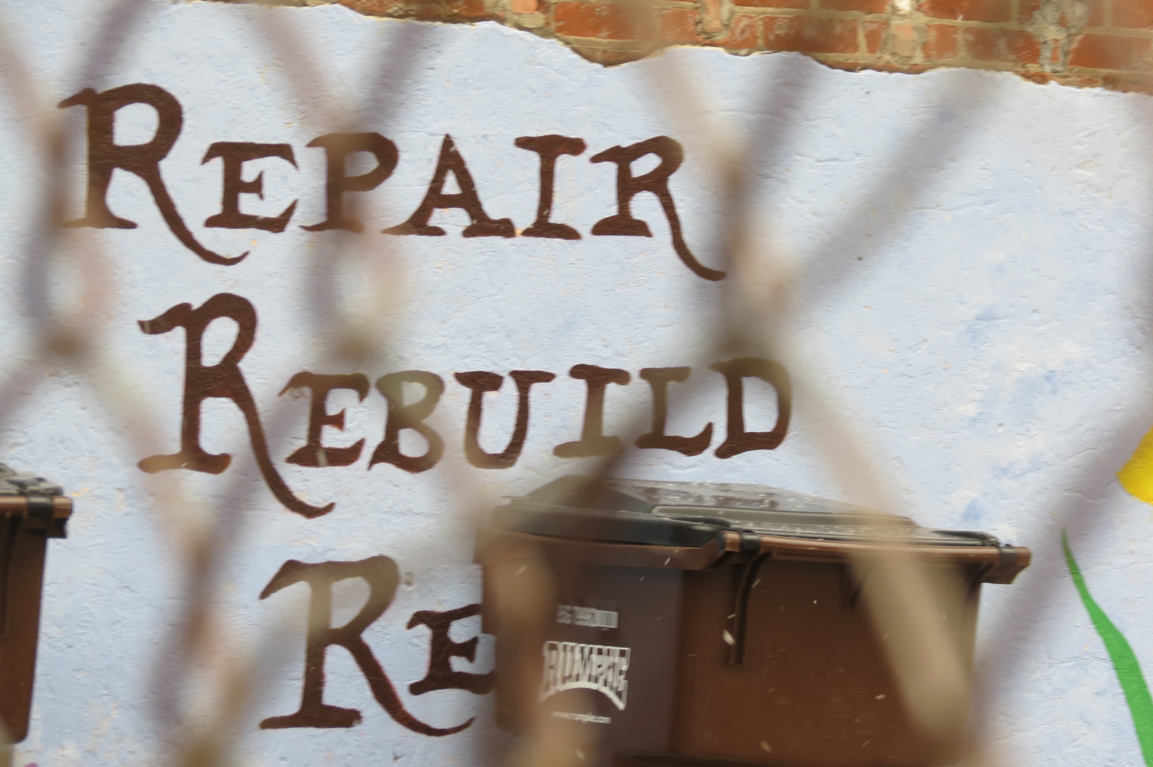 The words on the wall and hidden behind the trash are: Repair, Rebuild, Restore.